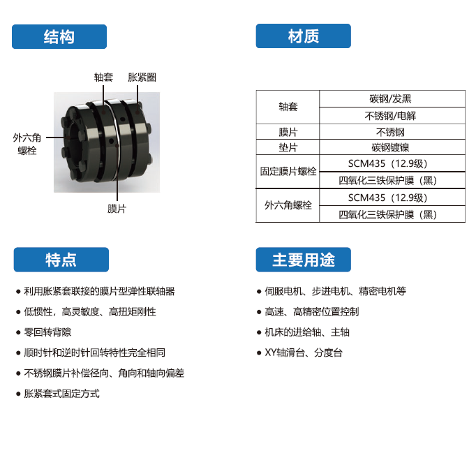 HDFPS-T系列聯(lián)軸器采用碳鋼發(fā)黑,利用脹緊套聯(lián)接的膜片型彈性聯(lián)軸器,廣泛用于伺服電機(jī)、步進(jìn)電機(jī)、精密電機(jī)等。