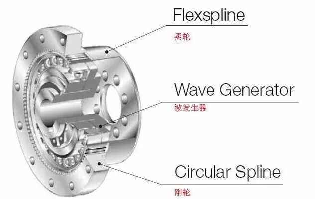 諧波減速機(jī)由“柔輪、波發(fā)生器、剛輪、軸承”這四個(gè)基本部件構(gòu)成。柔輪的外徑略小于剛輪的內(nèi)徑,通常柔輪比剛輪少2個(gè)齒。波發(fā)生器的橢圓型形狀決定了柔輪和剛輪的齒接觸點(diǎn)分布在介于橢圓中心的兩個(gè)對(duì)立面。波發(fā)生器轉(zhuǎn)動(dòng)的過程中,柔輪和剛輪齒接觸部分開始嚙合。波發(fā)生器每正時(shí)針旋轉(zhuǎn)180°,柔輪就相當(dāng)于剛輪逆時(shí)針旋轉(zhuǎn)1個(gè)齒數(shù)差。在180°對(duì)稱的兩處,全部齒數(shù)的30%以上同時(shí)嚙合,這也造就了其高轉(zhuǎn)矩傳送。