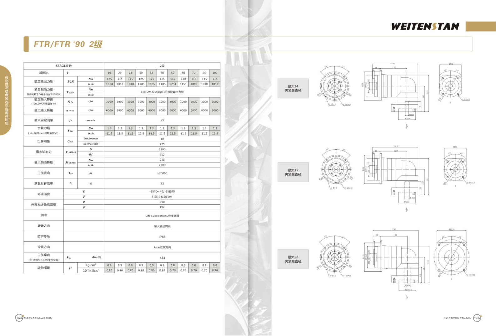 FTR系列高剛性高精度緊湊型直角減速機。 FTR產(chǎn)品系列的高精度高剛性轉(zhuǎn)角式減速機。緊湊的結(jié)構(gòu)型和簡單安裝方式。 極高的功率密度。盡管以往系列性能極為出色,但我們成功的將扭矩提高了近40%。不斷提高極限值,典型威騰斯坦產(chǎn)品! 電機安裝簡易。電機可安全簡易的一步安裝,另外您也可以選擇威騰斯坦享有的專利權(quán)的,帶有長度補償軸的安裝。 任意位置安裝。不管你在哪個位置安裝,你的齒輪箱始終有相同的潤滑油/潤滑脂量。安裝靈活、齒輪箱能夠垂直、水平、與從動軸一起向上或向下安裝。 極高的定位精度。根據(jù)用戶需求,你可獲得回程間隙小于角分的高型行星齒輪箱。這也大大提高了你應用上的定位精度。 通過齒輪嚙合,運轉(zhuǎn)平穩(wěn)。相比直齒嚙合齒輪箱,本公司的斜齒嚙合齒輪箱運轉(zhuǎn)噪音減低了50dB-A,你深知50dB-A所創(chuàng)造的價值遠遠高于70dB-A。此外還有:不再感動振動,運轉(zhuǎn)平穩(wěn)到令人驚訝。 世界水平的預期壽命。原材料進行了優(yōu)化,幾何形狀同樣進行了優(yōu)化。